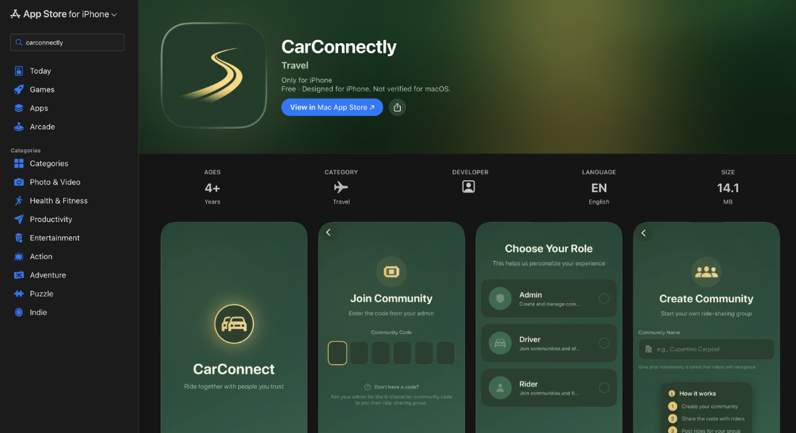 With CarConnectly ready to go, we now have a shared tool to make transportation smoother, more affordable, and environmentally friendly.
